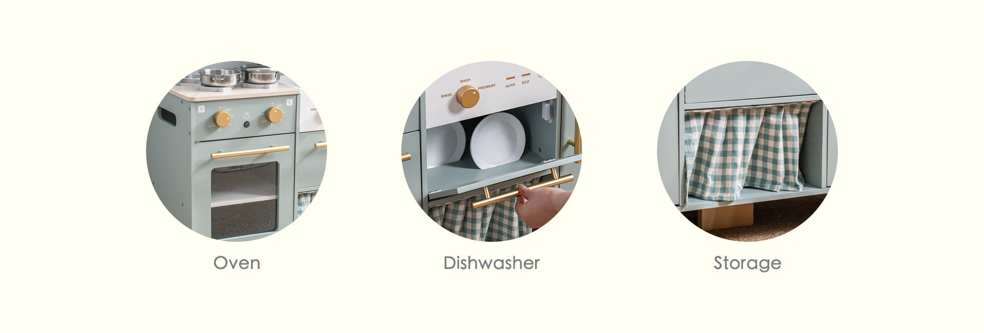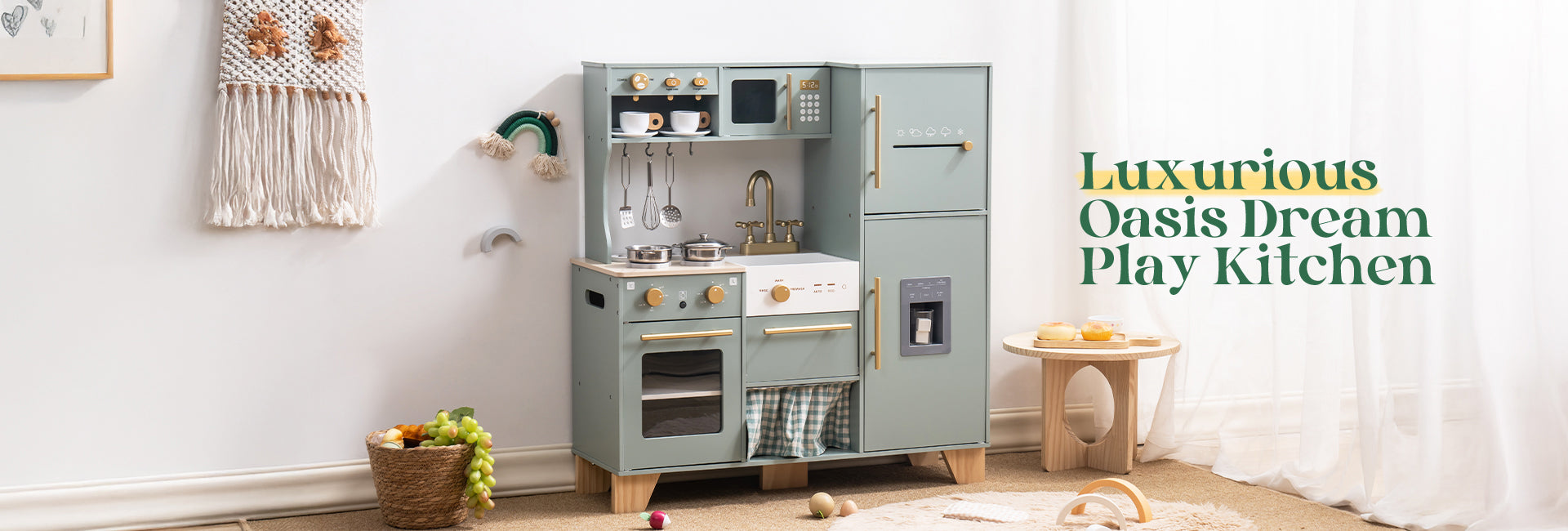 The Play Kitchen Adventure features a farmhouse sink with a rotating faucet, letting kids imaginatively recreate washing up and cooking. The oven door opens smoothly to reveal a spacious interior, perfect for pretend baking and roasting. Shelves and hooks add an authentic touch while providing practical storage for play dishes and accessories.
